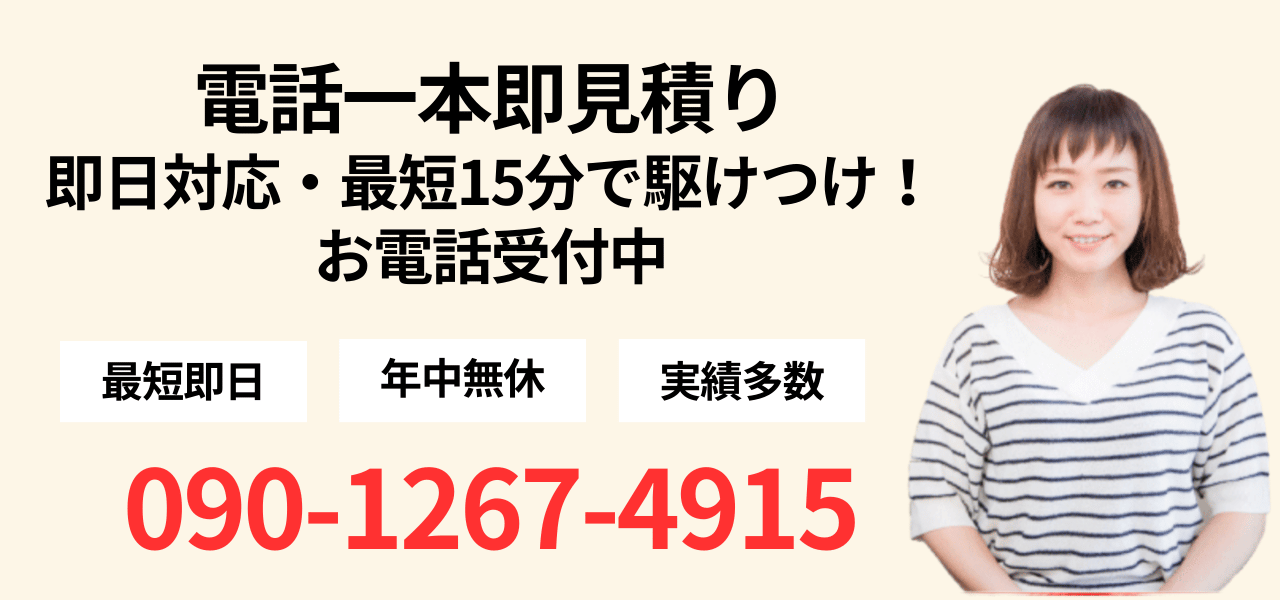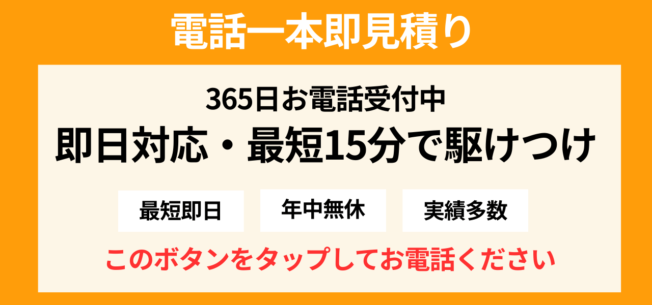 まずはお電話の際にコールセンターのスタッフがお客様の元までどれくらいでお伺い できるか、おおよその時間をお伝えさせていただきます。 お客様がお住まいのエリアで巡回・待機している作業スタッフに連絡をし、迅速に お伺いいたします。